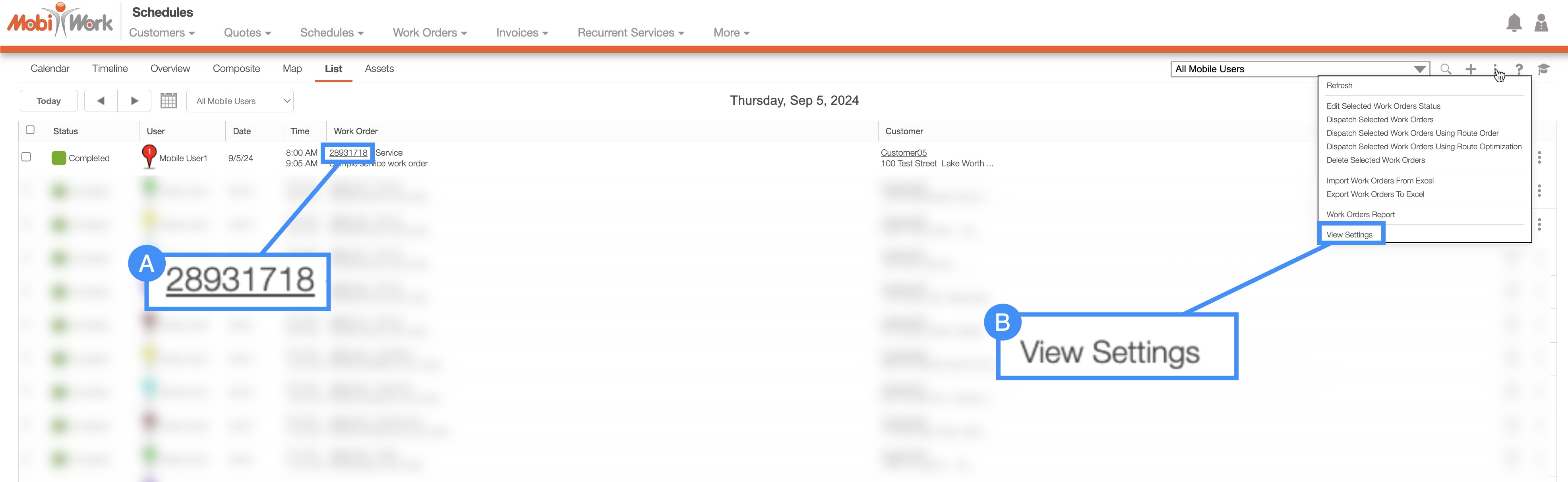By clicking on the More Actions button located at the top-right of the Work Orders feature page, and from the drop-down selecting the "View Settings" option.