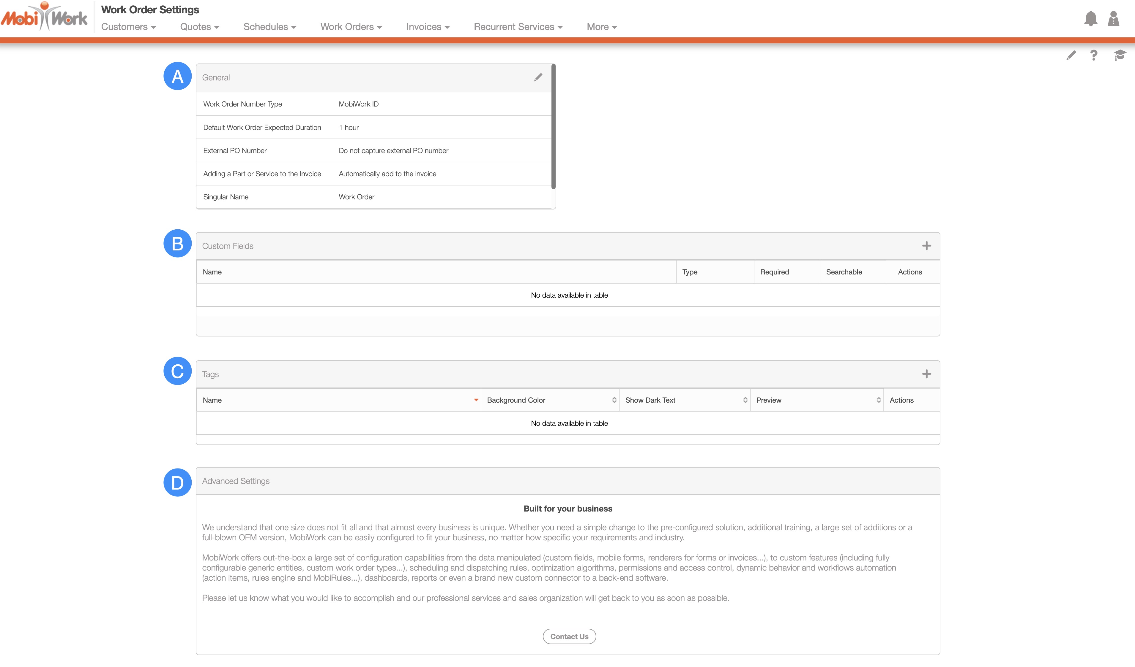 Once you are on the Work Order Settings page there will be a number of different sections: