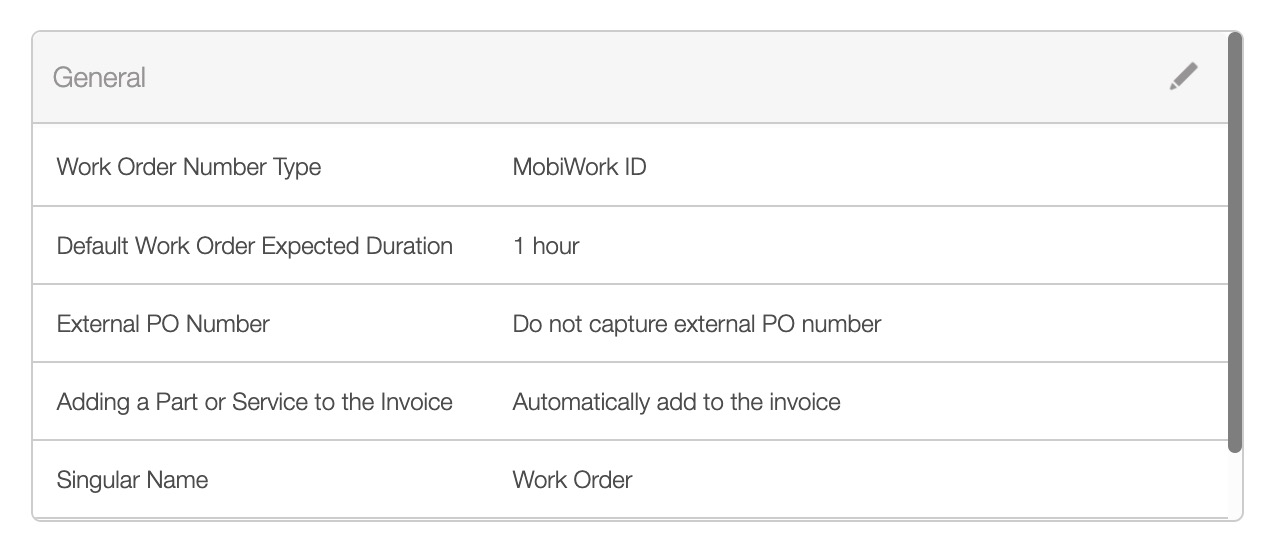 The General Section will display the work order number type, the default planned duration of your work orders, the external PO number of your work orders, and adding parts/services to the work order. In this section, you also have the option to specify the term you use to refer to your work orders: