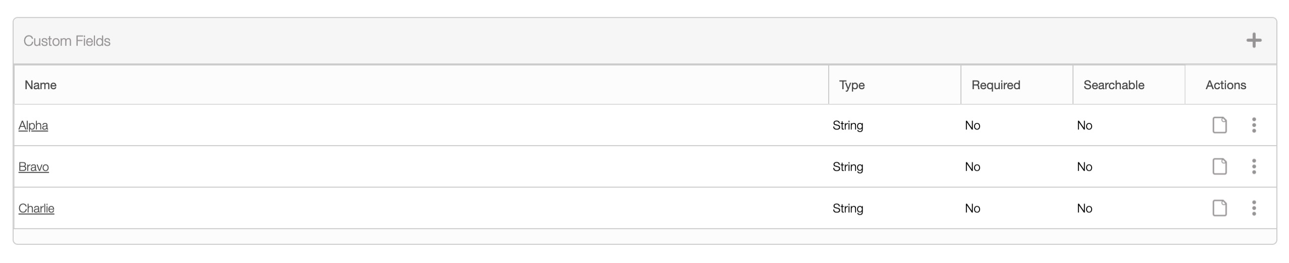| "Type" | The type of custom field which includes string, number, decimal, date, yes/no, multiple choice, QR code, signature, header, image capture, notes, phone number, phone number plus extension, SSN, time field, text area, vertical separator, vertical spacing, multiple QR code, customer field, product field, user field, project field, asset field, store field, dynamic header, and multiple option drop-down. |