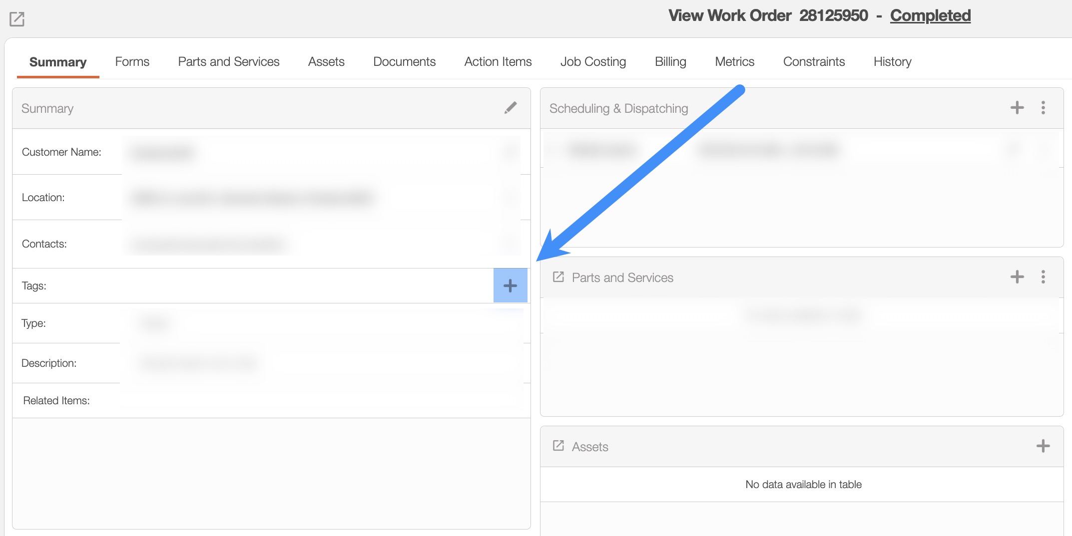 To add a new tag to your work order, open the View Work Order pop-up window and in the "Summary" panel click on the Plus Sign for the "Tags" column; if you have already added tags to your work order, this icon will turn into a Pencil icon: