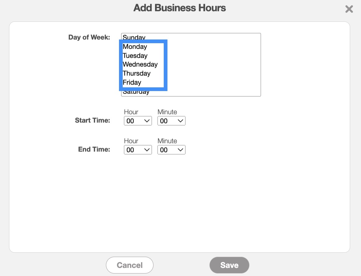- Choose the Day(s) of Week and select your Start Time and End Time using the "hours" and "minutes" drop-down menus: