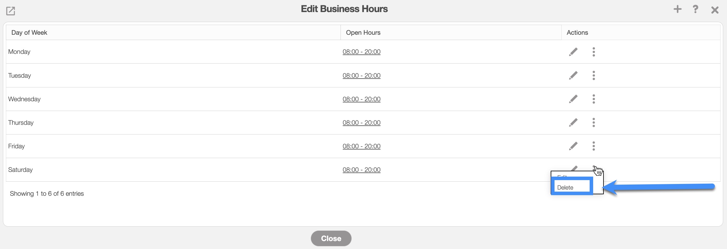- On the Edit Business Hours window, remove each day's hours by clicking the More Actions drop-down arrow, then choosing Delete: