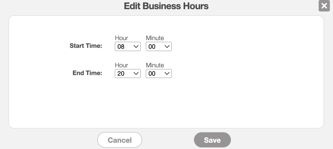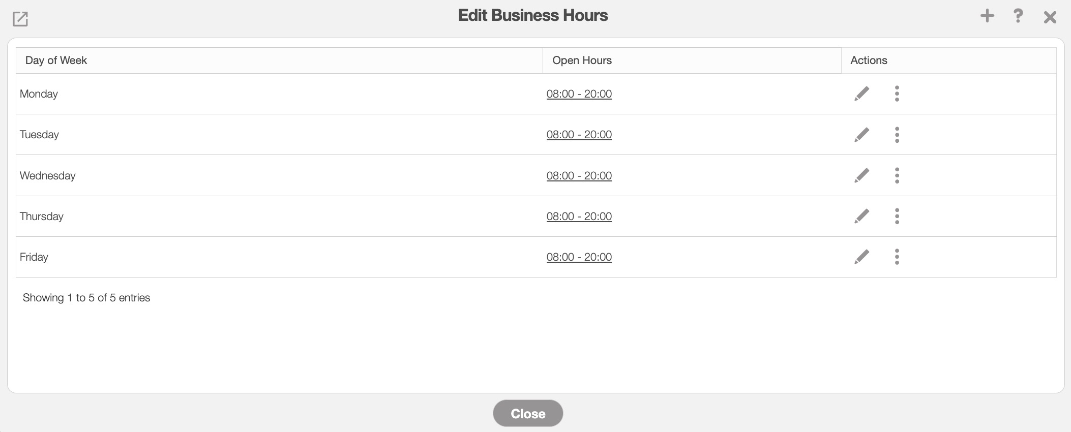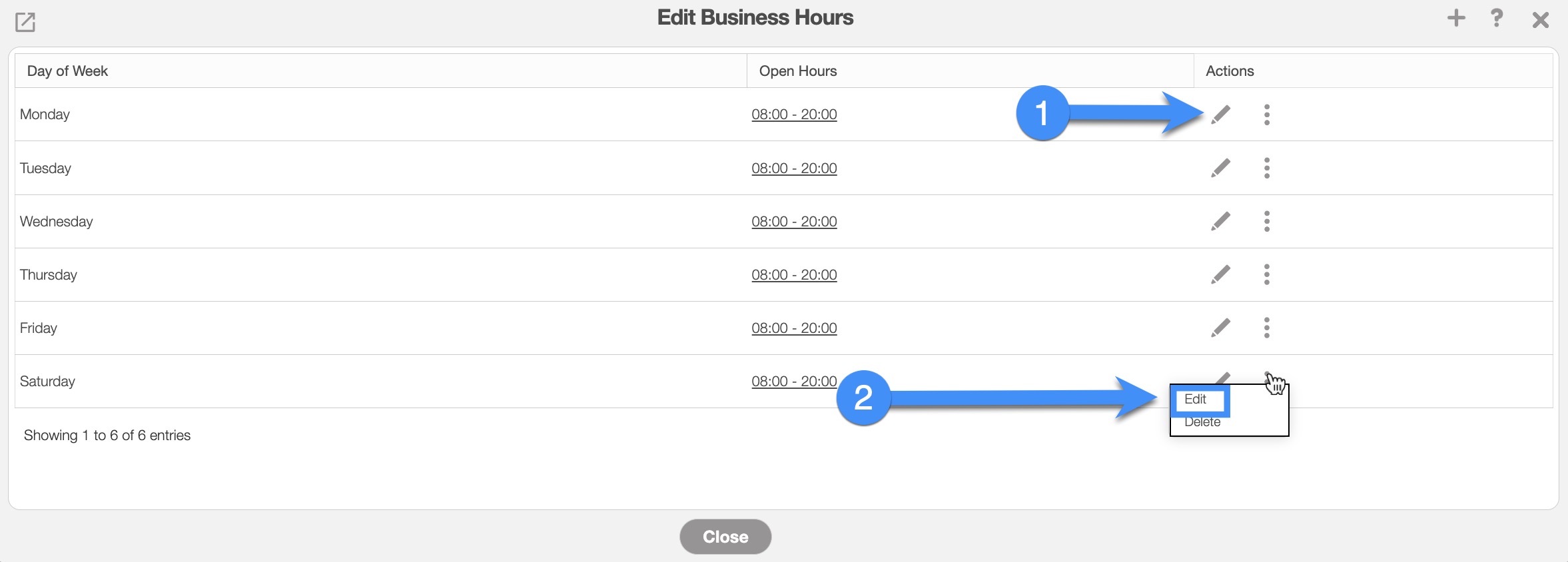 - This will display the Edit Business Hours modal window. Click the (1) pencil icon, or (2) More Actions > Edit for any of the days that need to be changed: