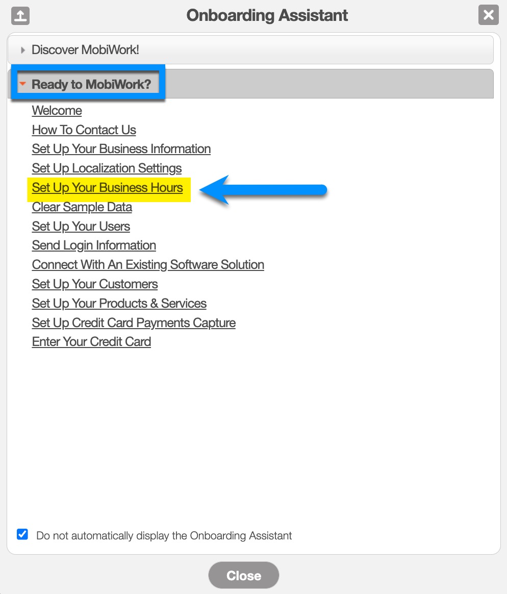 - From here, select the "Ready to MobiWork?" tab and choose the Set Up Your Business Hours option: