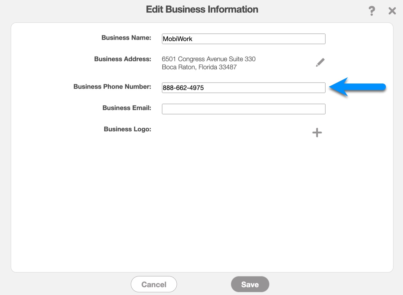 - The business phone number that you enter here, will be used in email notifications to the customer and when sending appointment updates (text or email), invoices, or quotes to the customer: