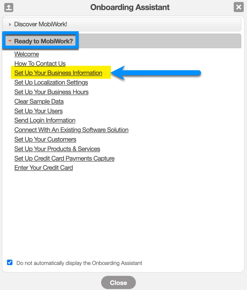 - From here, select the "Ready to MobiWork?" tab and choose the Set Up Your Business Information option: