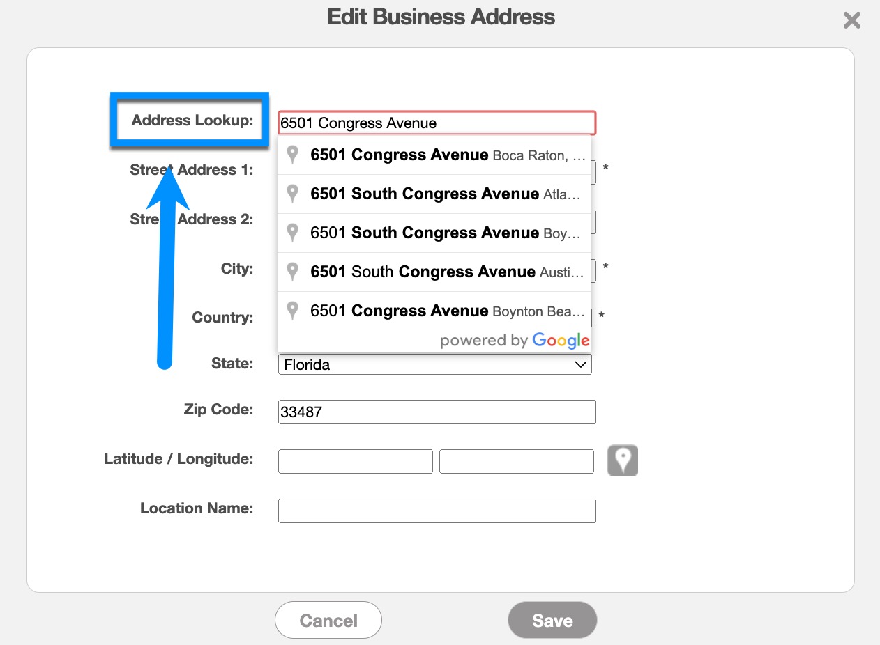 - You can enter your new Business Address in the fields provided. You can also use the Address Lookup field to search for your new address; as you type in this field, different address results will appear. Please click on the desired address listing from the drop-down. Once you are done, click on the Save button: