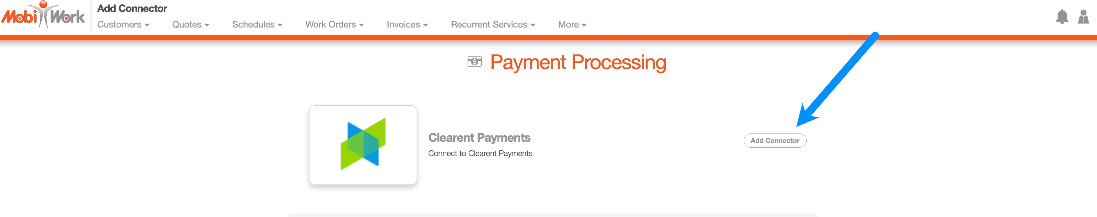 - Next, scroll down to the Payment Processing section, locate Clearent and click Add Connector: