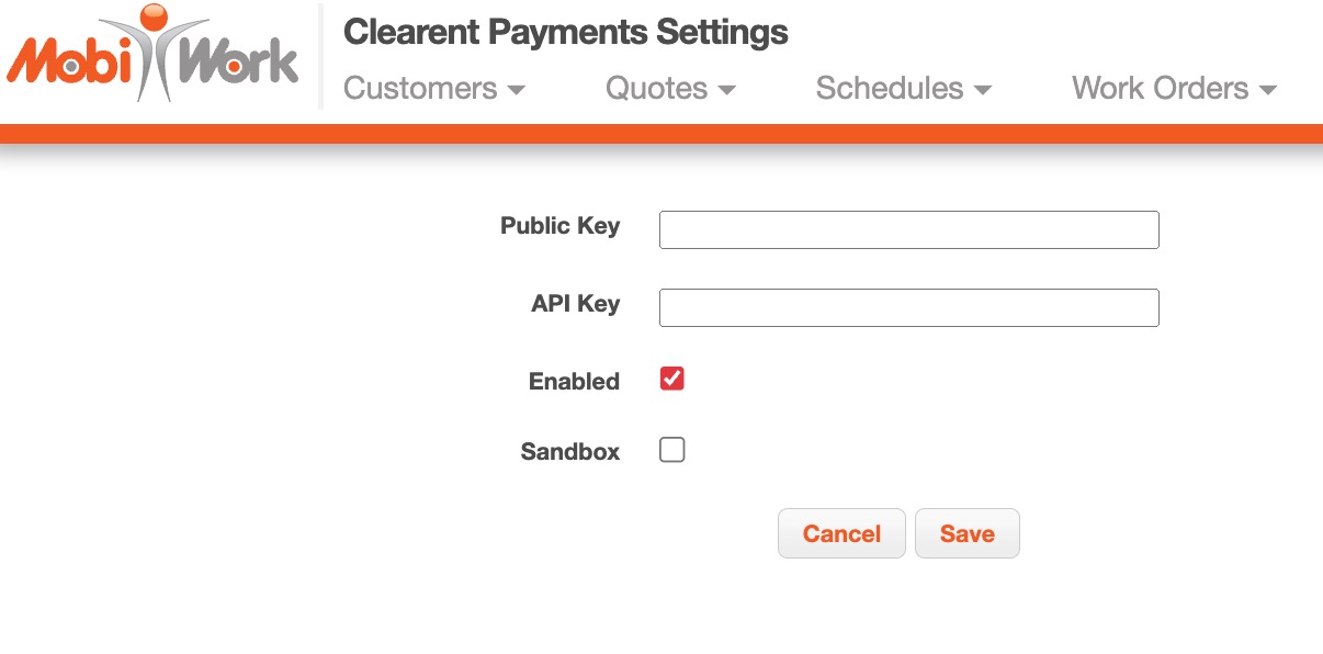 - Once your Clearent account has been set up, your unique API and Public Keys will be created. These will be used when integrating Clearent with MobiWork, outlined in the section below.