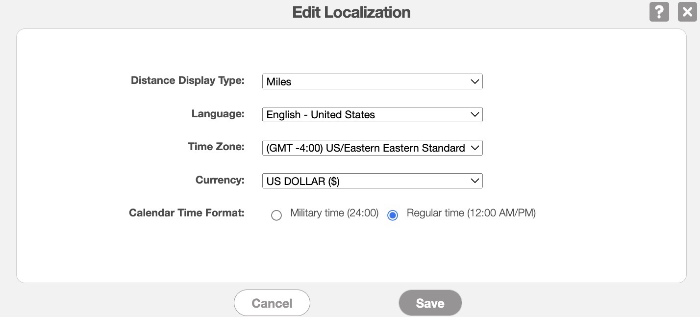 You can update your language, time zone, currency, and time-format through the MobiWork Localization Settings. This section will highlight how to access and update these settings.