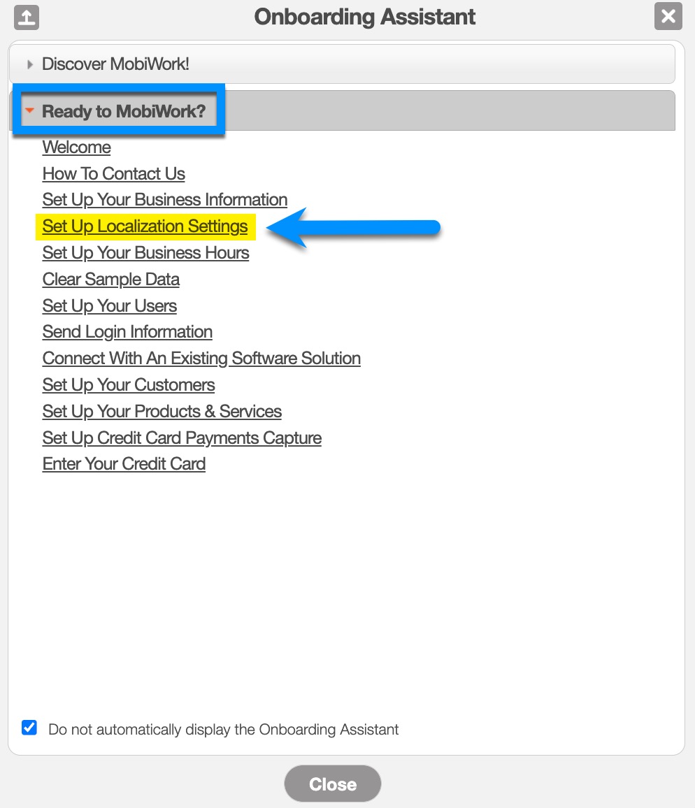 - From here, select the "Ready to MobiWork?" tab and choose the Set Up Localization Settings option: