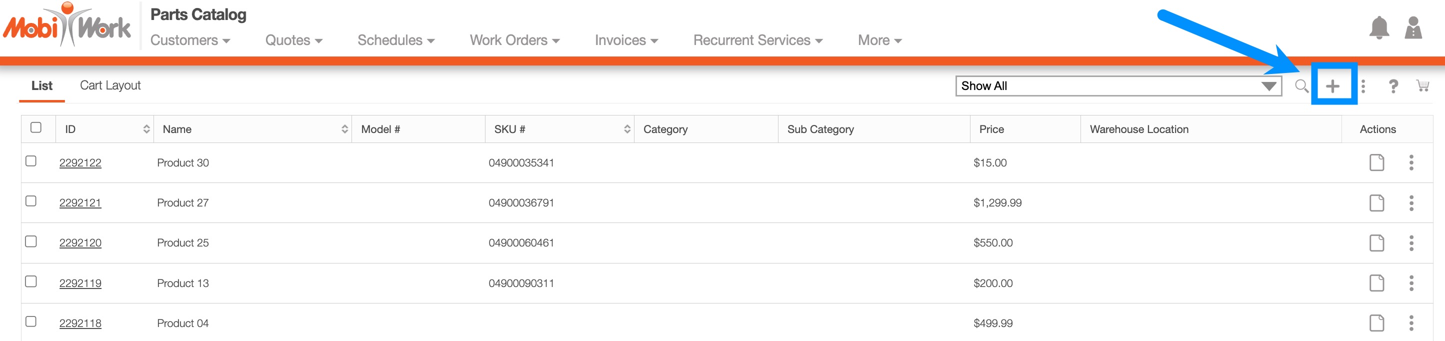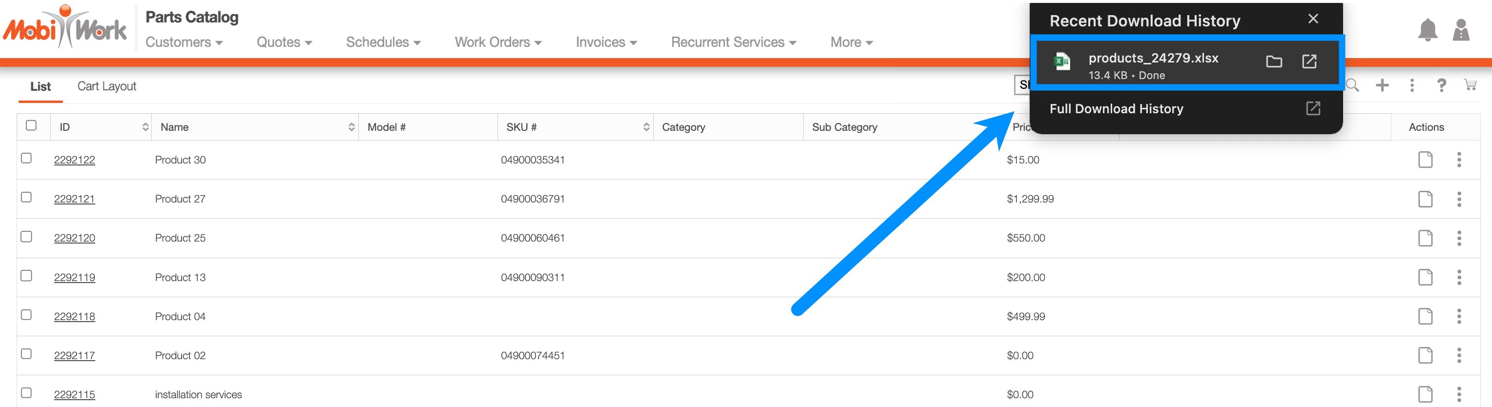 - Save the spreadsheet, then return to the MobiWork Parts Catalog.