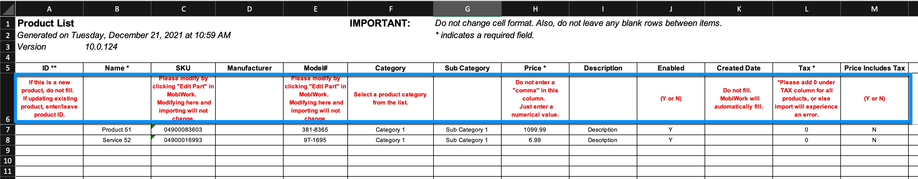 - The double asterisks (**) on the import template indicate that the specified fields are conditional and should be populated in specific circumstances. For example, the "ID" field is only required if the part or service already exists within MobiWork:
