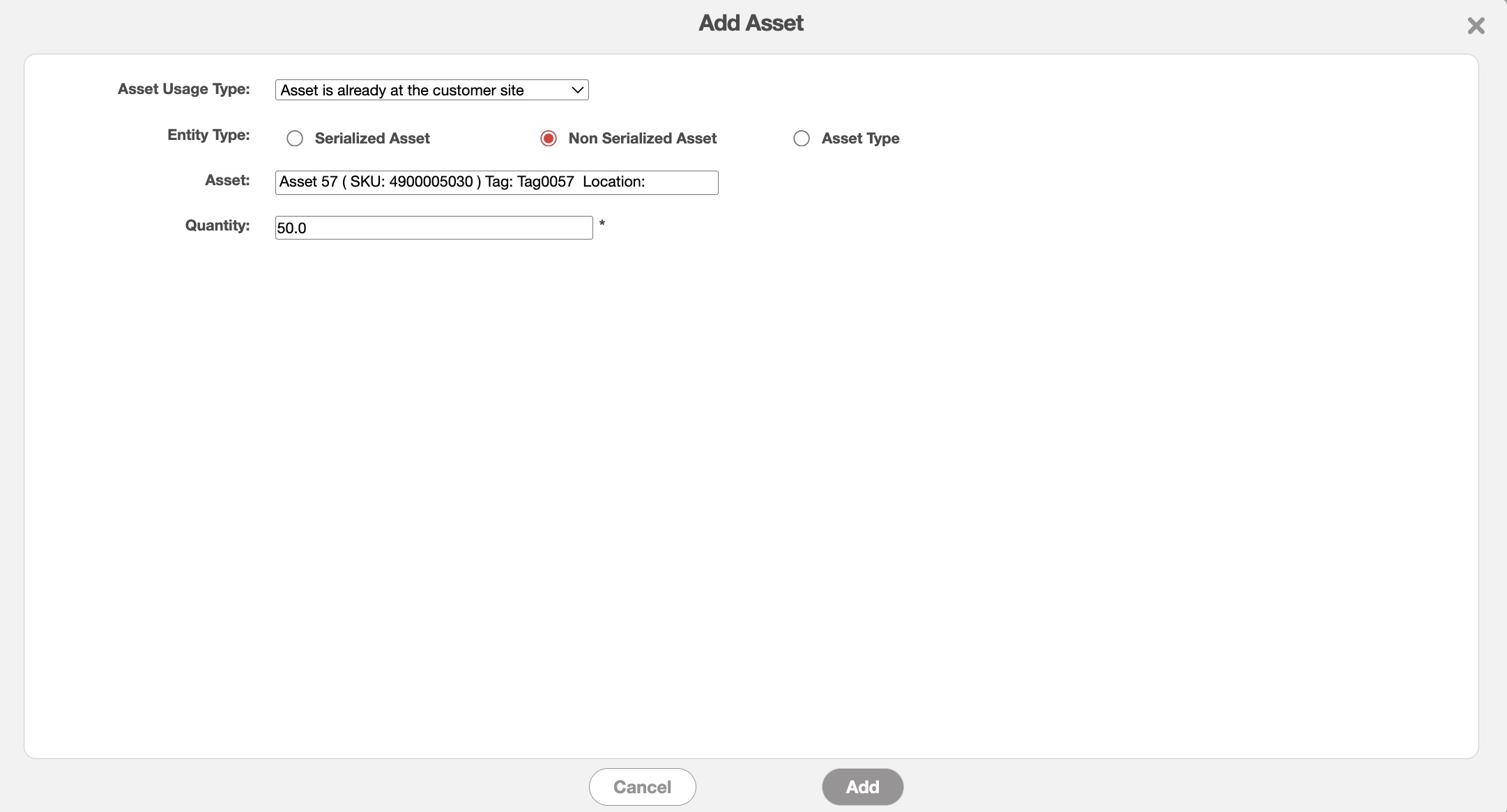 For more information on how to add non-serialized assets to a work order, please see Adding Non-Serialized Assets to a Work Order subsection.