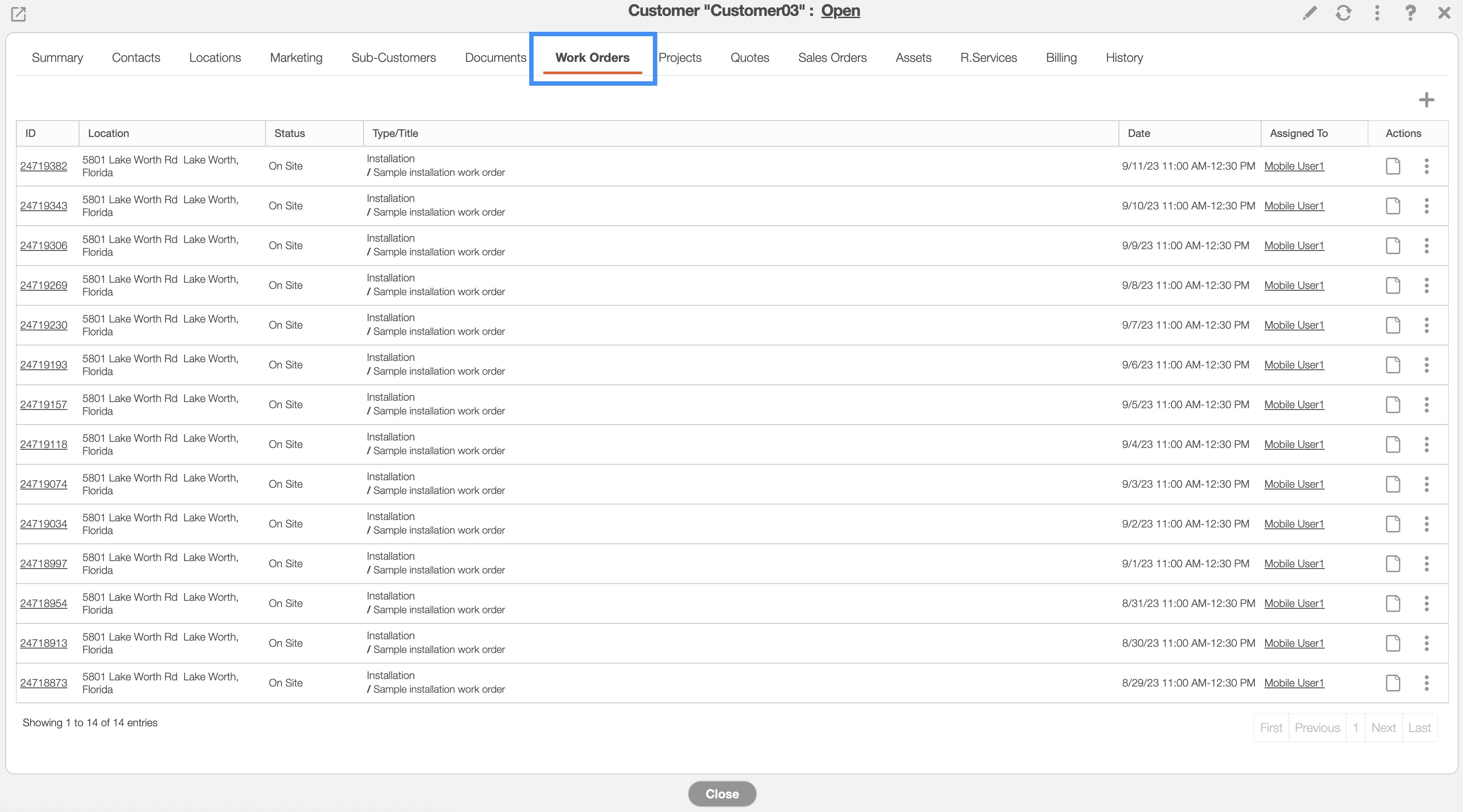 Work Orders can be viewed from the "Work Orders" tab. For more information on how to access these tabs, please see the View Customer page: