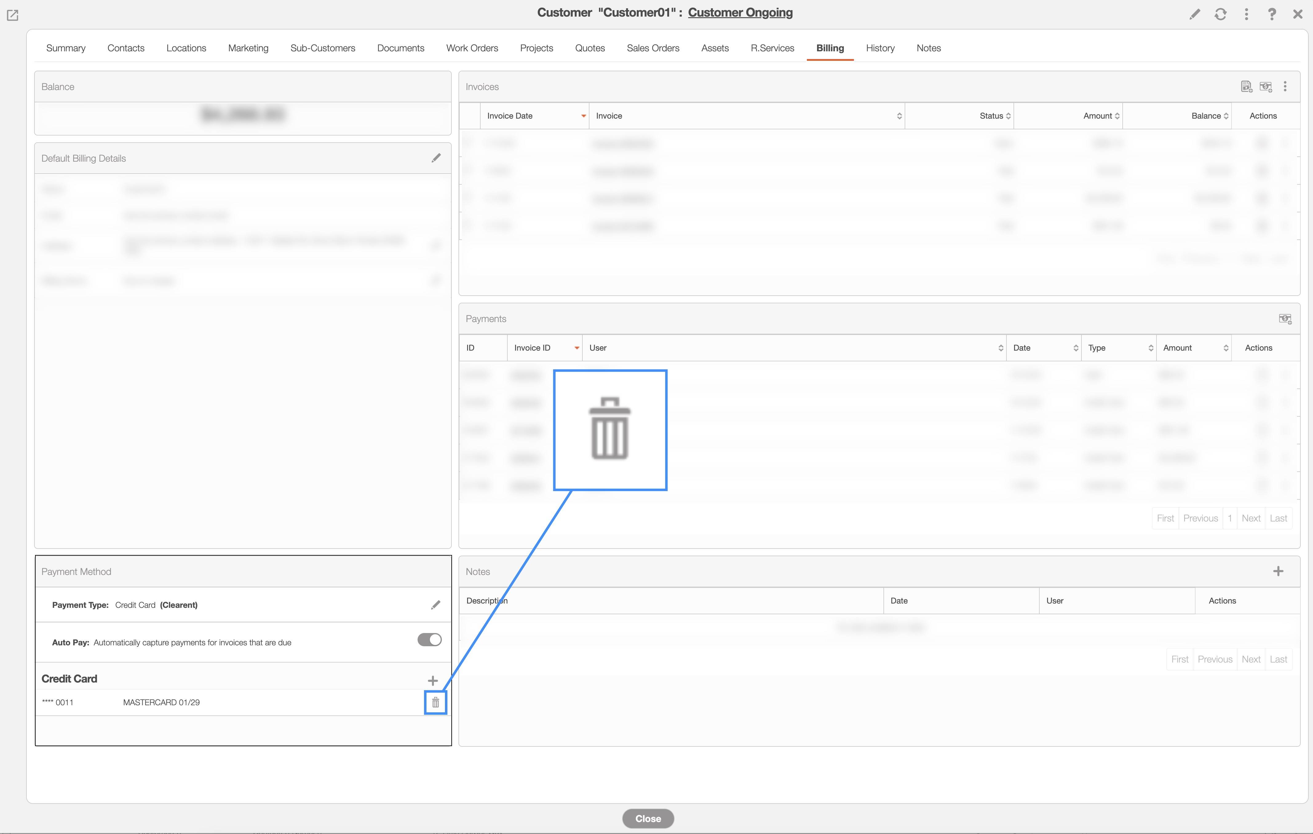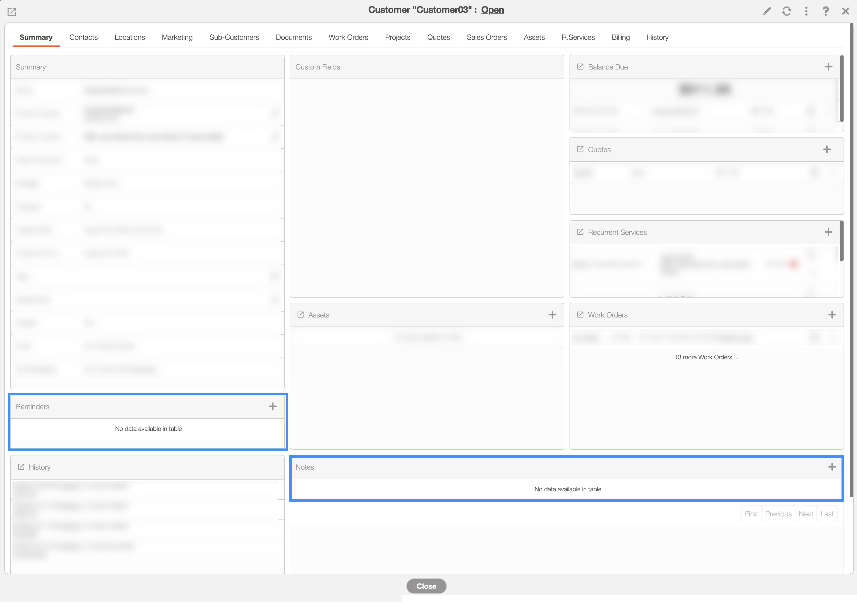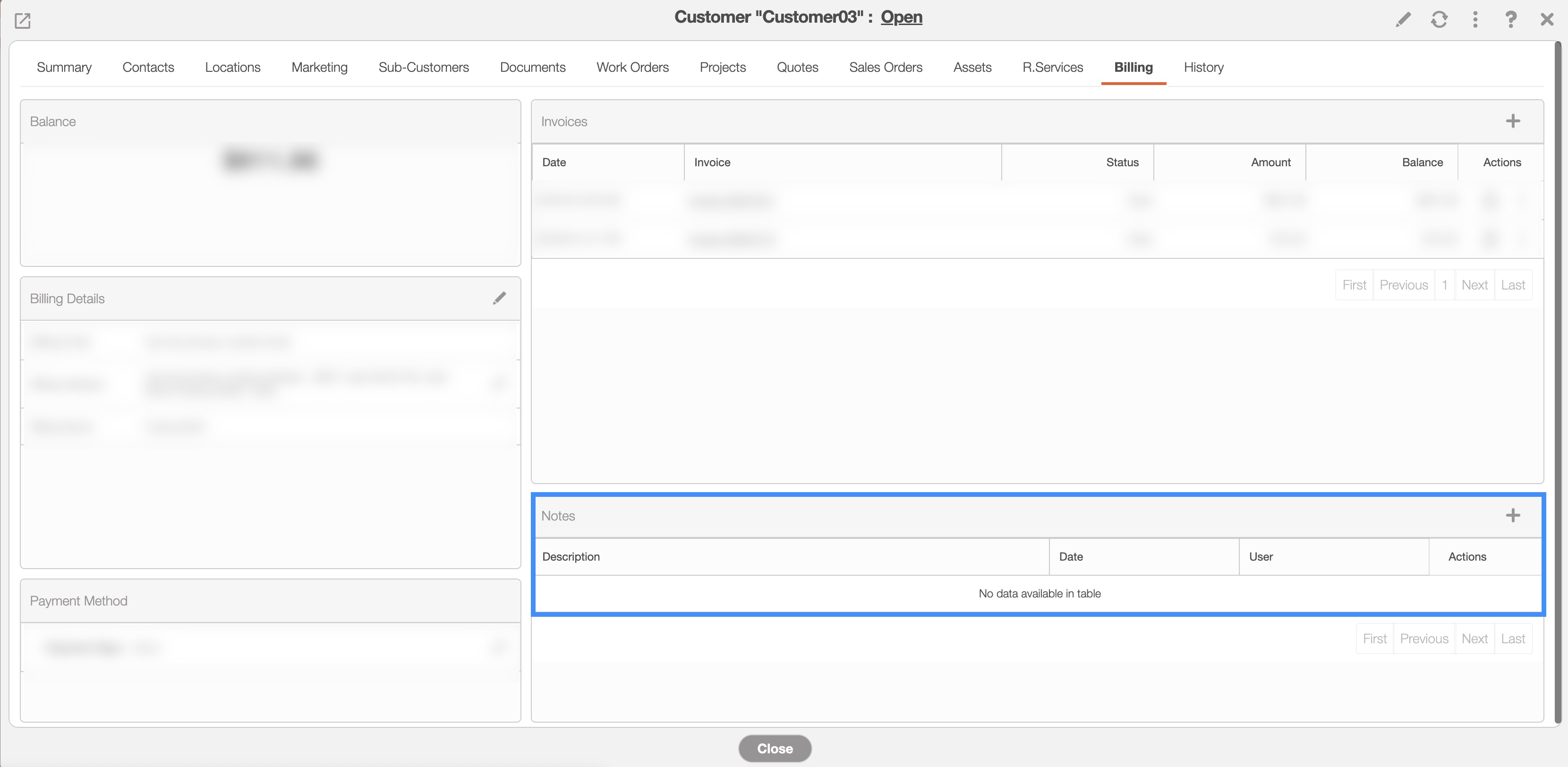 The "Notes" column in the "Billing" tab can also be used to capture billing specific details. For more information about the notes and reminders feature, please see the View Customer page: