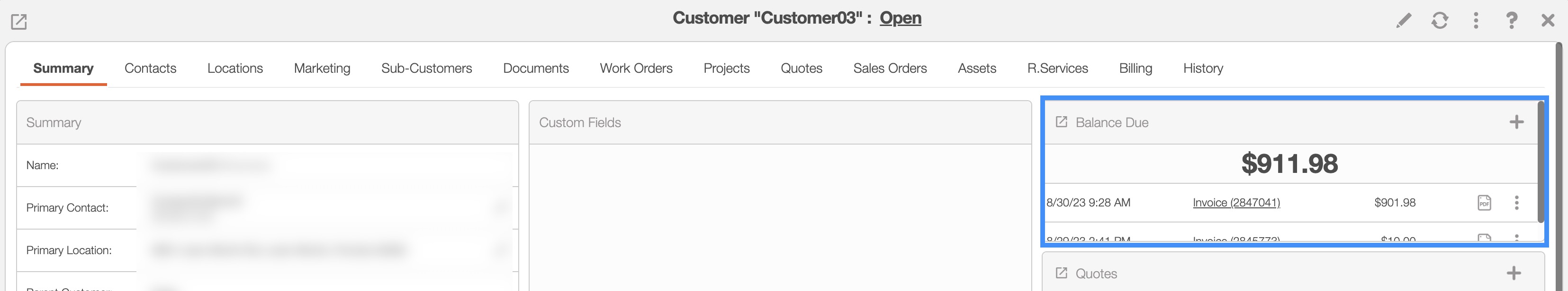 You will be able to view outstanding invoices, payments, work orders, and more from the View Customer screen. Invoices and Payments can be viewed from the "Summary" tab in the "Balance" column: