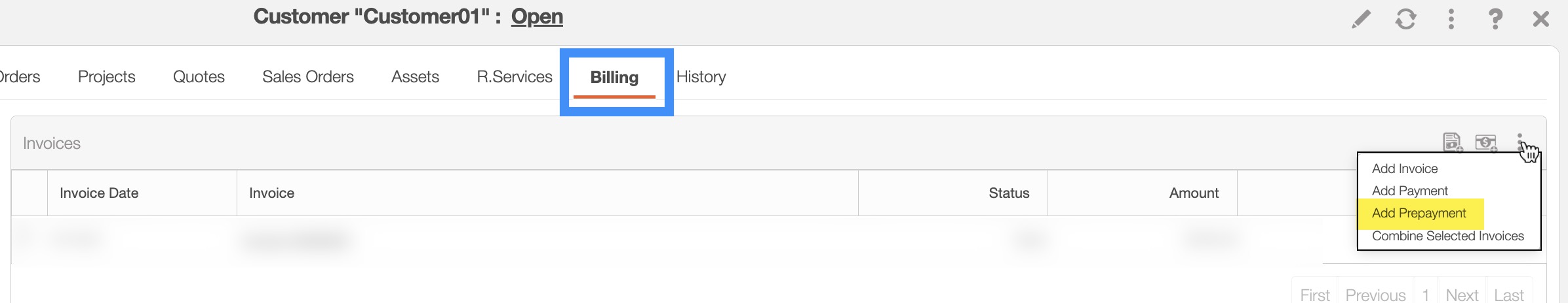 In the "Invoices" panel, click on the Individual Actions button and from the drop-down select the "Add Prepayment" option: