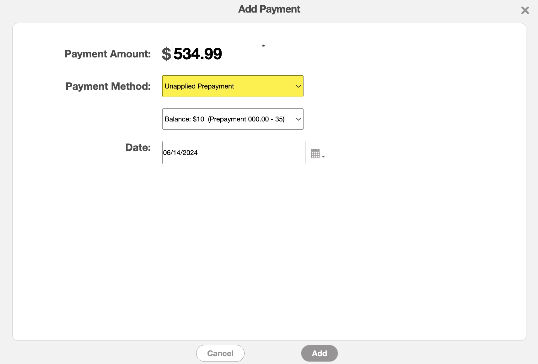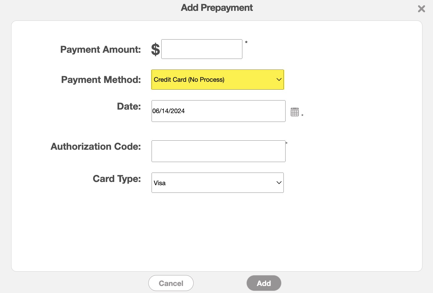 The Add Prepayment pop-up window will then appear. Input the payment amount and select the "Credit Card (No Process)" option for the "Payment Method" field: