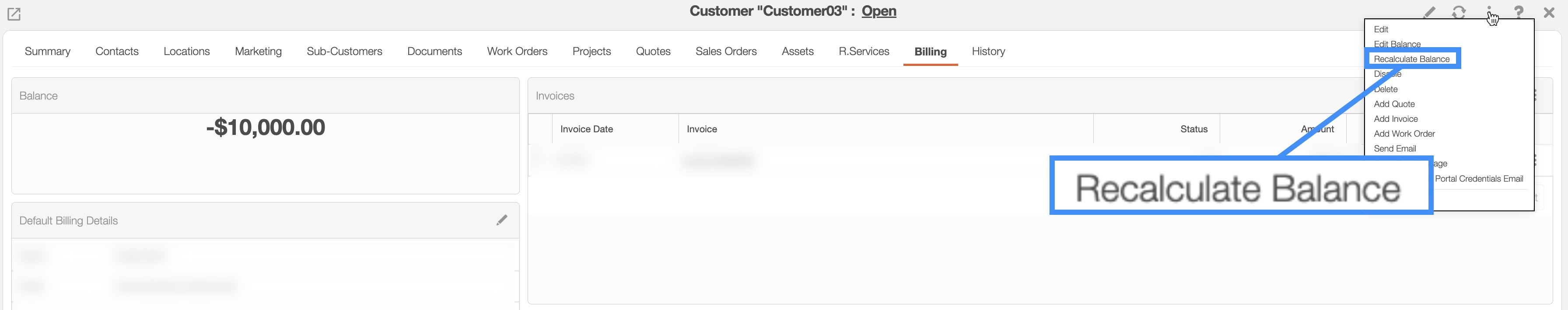 Select the "Recalculate Balance" option from the Individual Actions button to update the customer's remaining billing balance: