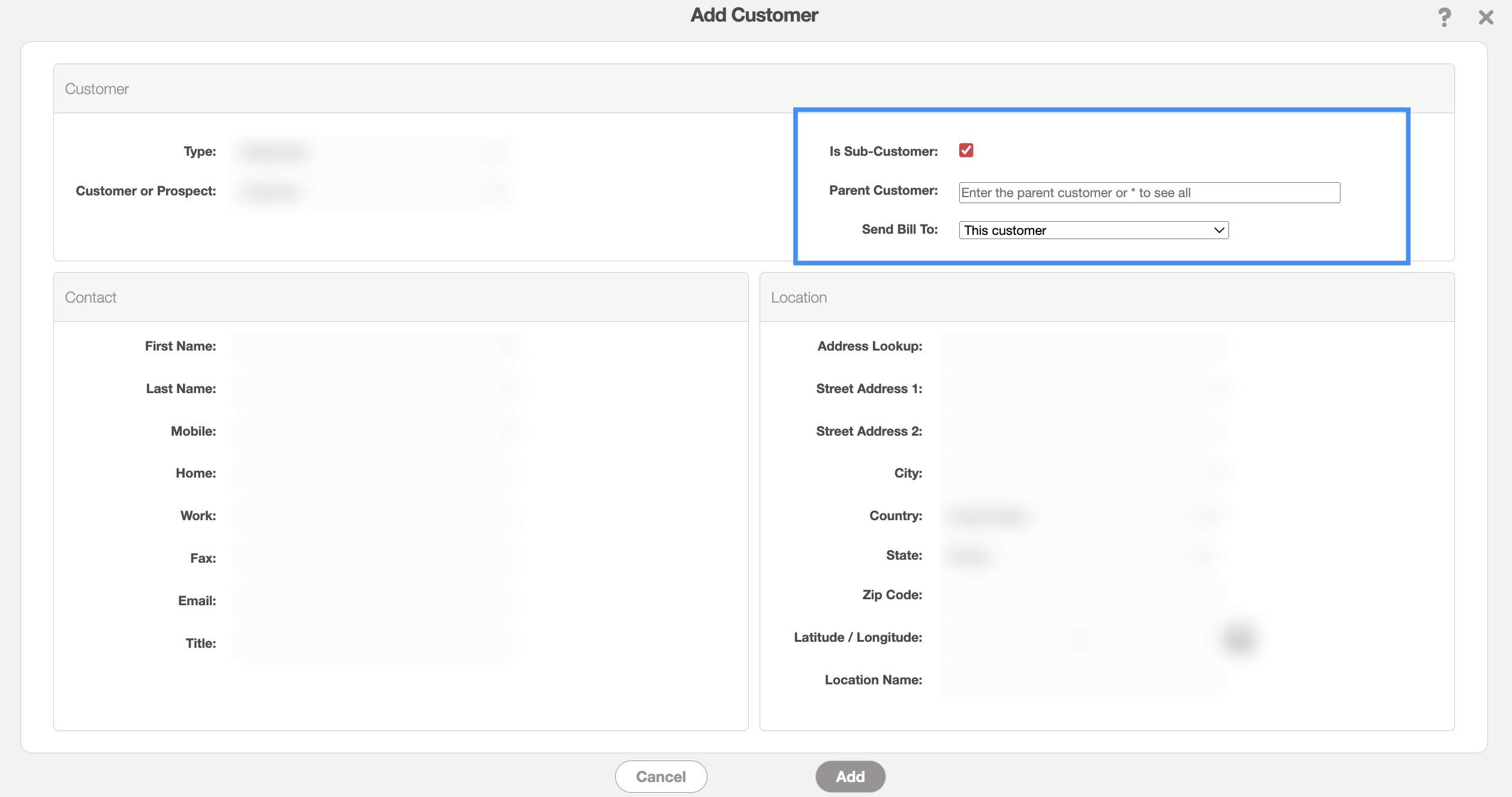 In the Add Customer or Edit Customer pop-up window, you can indicate if a customer is a subcustomer by clicking on the "Is Sub-Customer" checkbox. In the "Parent Customer" field input the parent customer who oversees the subcustomer. Next, specify which customer is getting the bill (i.e., the sub-customer, the parent customer, or another customer):