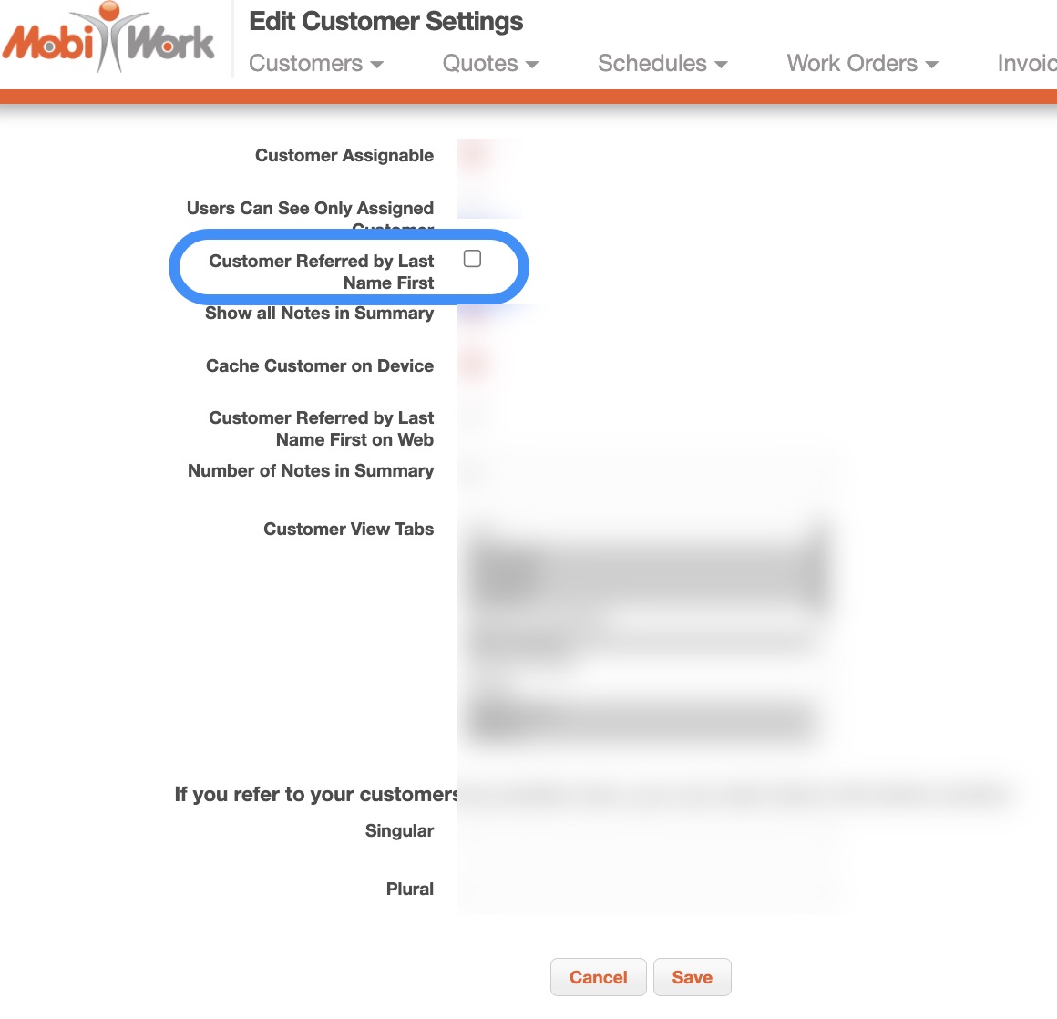 On the Edit Customer Settings page, click on the checkbox for the "Customer Referred by Last Name, First" option. Click on the Save button to finalize the update: