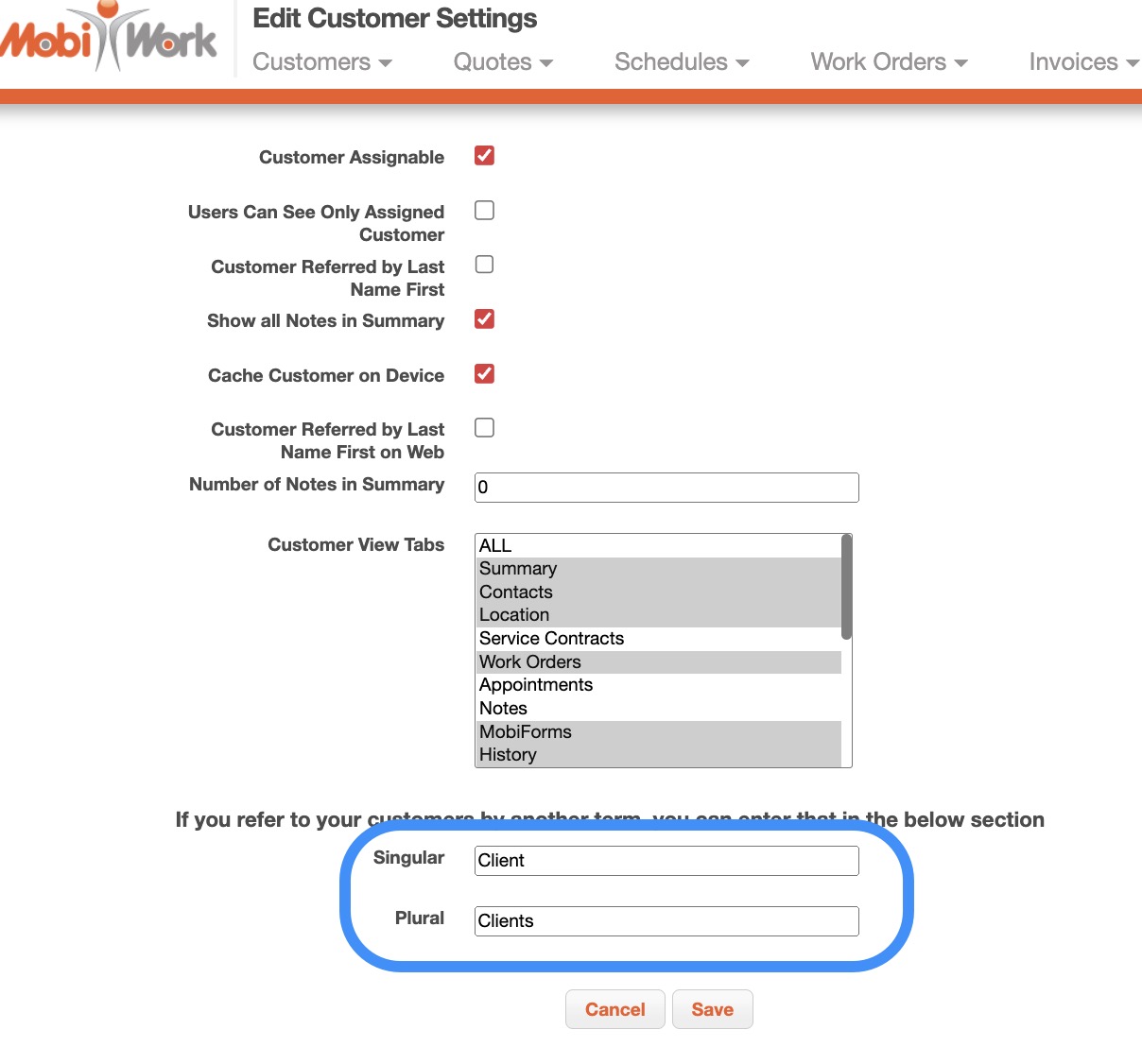 If you would like, you can update the singular and plural versions of how you refer to your customers. (e.g., client / clients, consumer / consumers, etc.). To update your customer term, you will first need to navigate to the Customers Settings page. For more information about this page, please visit Customer Settings page.