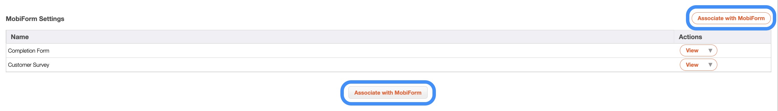 Once on this page, you can associate forms by clicking the Associate with MobiForm button in the MobiForm Settings section: