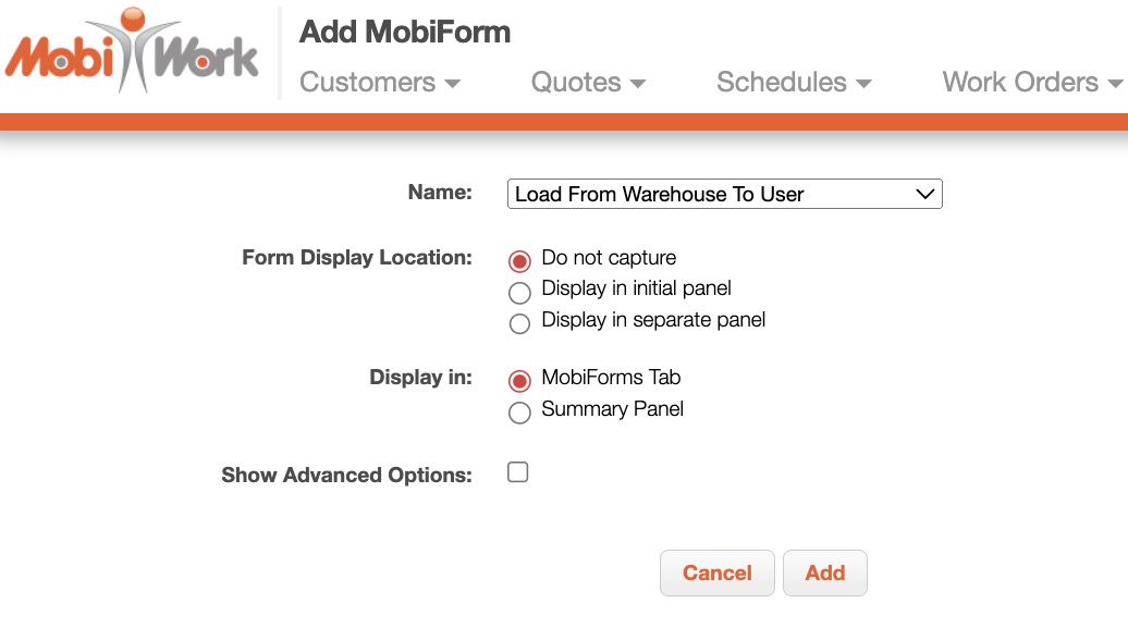 You will then be redirected to the Add MobiForm page. On this page select the desired form and click the Add button to finalize: