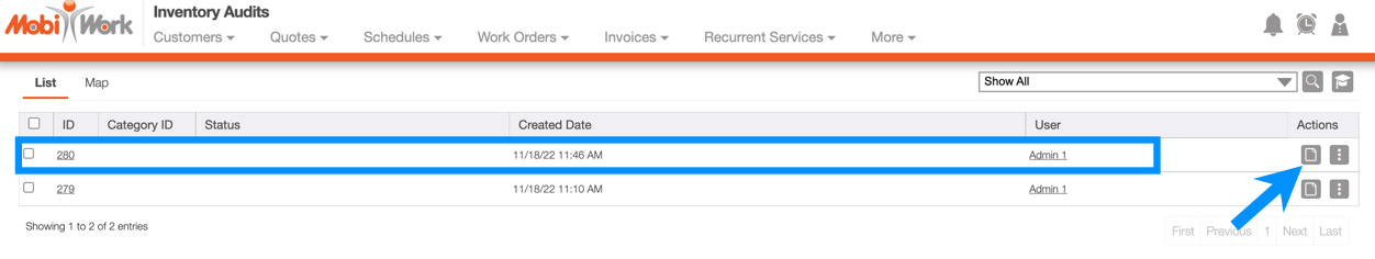 Users on the web can view any of the Inventory Audits completed by mobile device users, once they have been saved.
