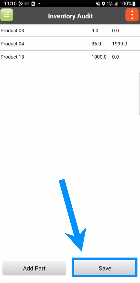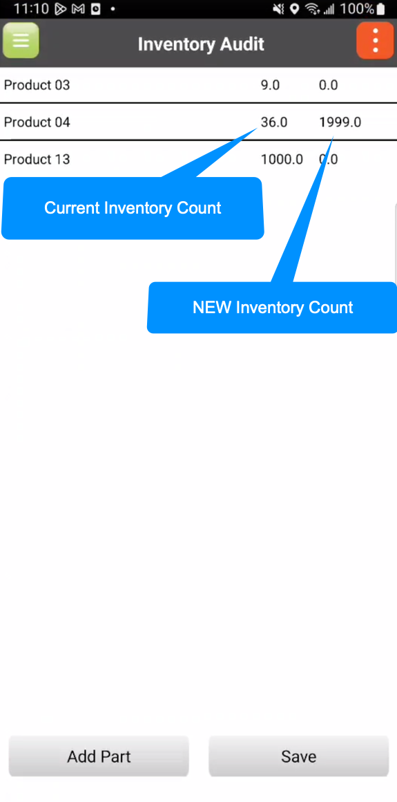 - Complete the Inventory Audit by adding parts from the Add Part button: