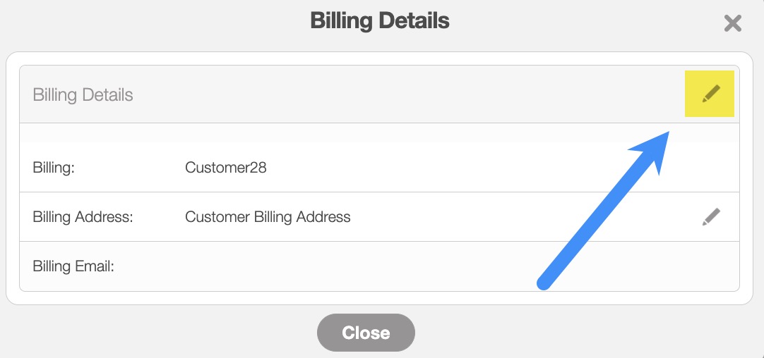 The Billing Details pop-up window will then appear. In this pop-up window click on the click the Pencil icon: