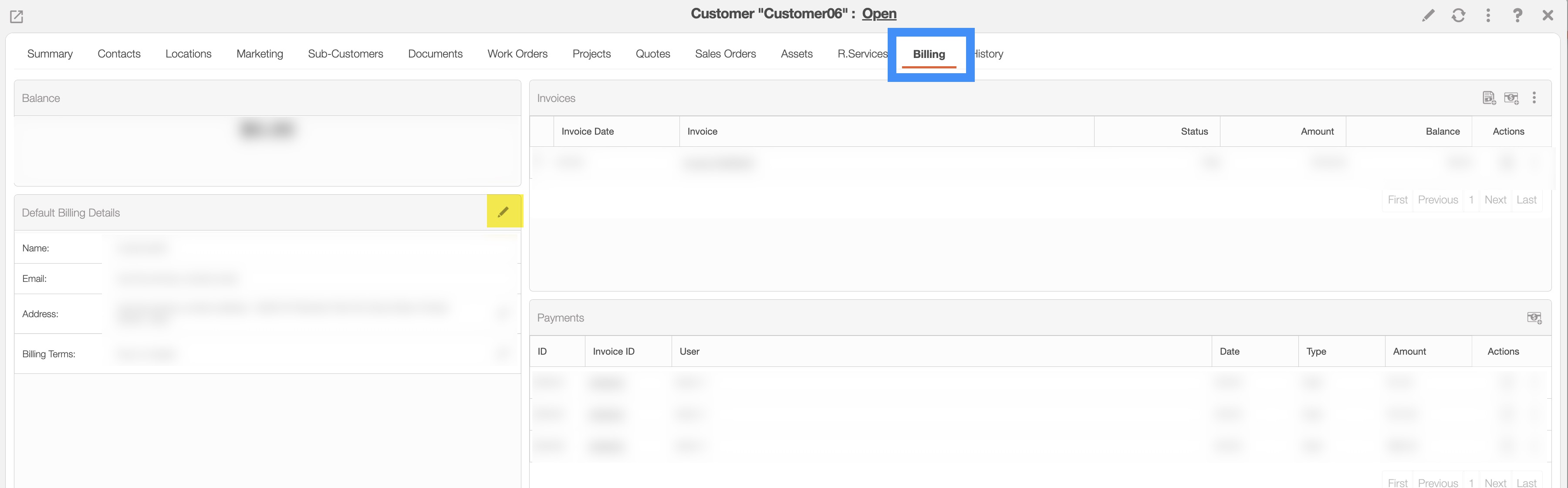 You can update the billing details so that it applies all to future invoices. To accomplish this, you will first need to open the View Customer pop-up window's "Billing" tab. For more information about this pop-up window, please see the View Customer page.