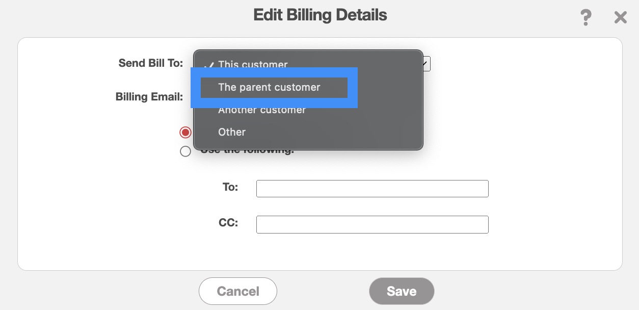 In the "Send Bill To" drop-down, select the "The Parent Customer" option to confirm that the bill-to customer should be the parent customer.