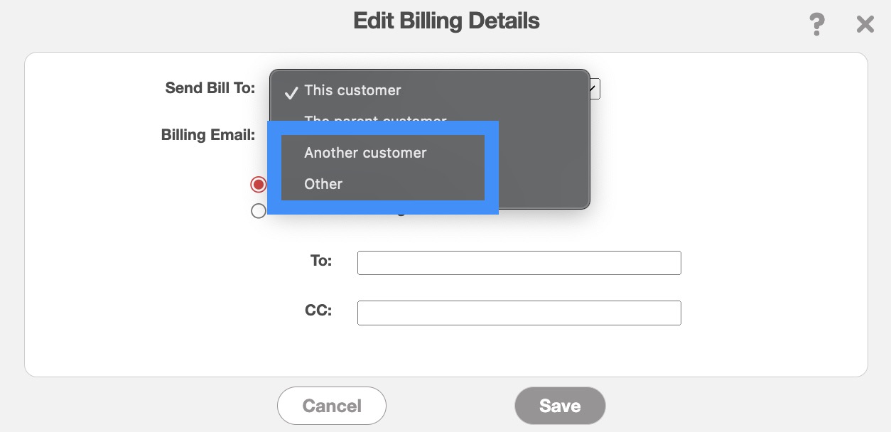 From the "Send Bill To" drop-down, select the desired recipient for the invoice: