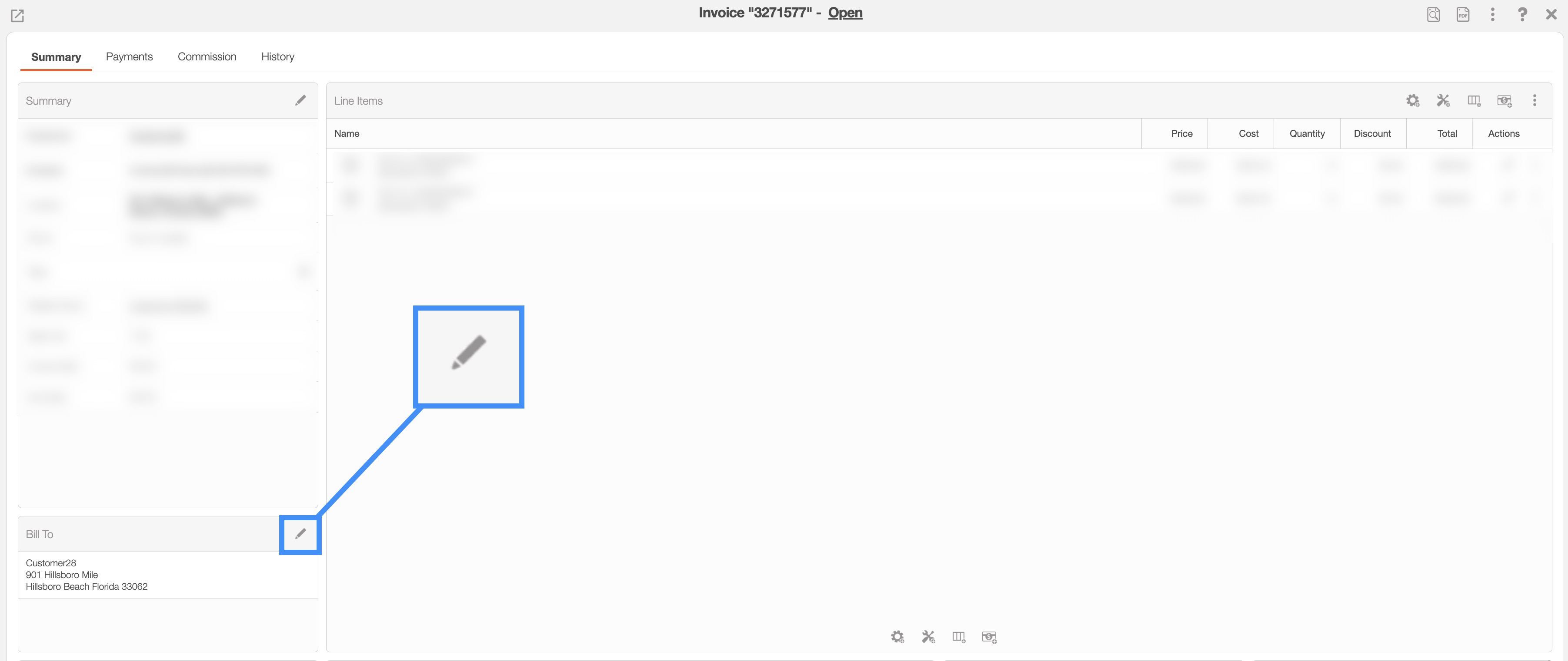 On the View Invoice pop-up window, click the Pencil icon on the "Bill To" panel: