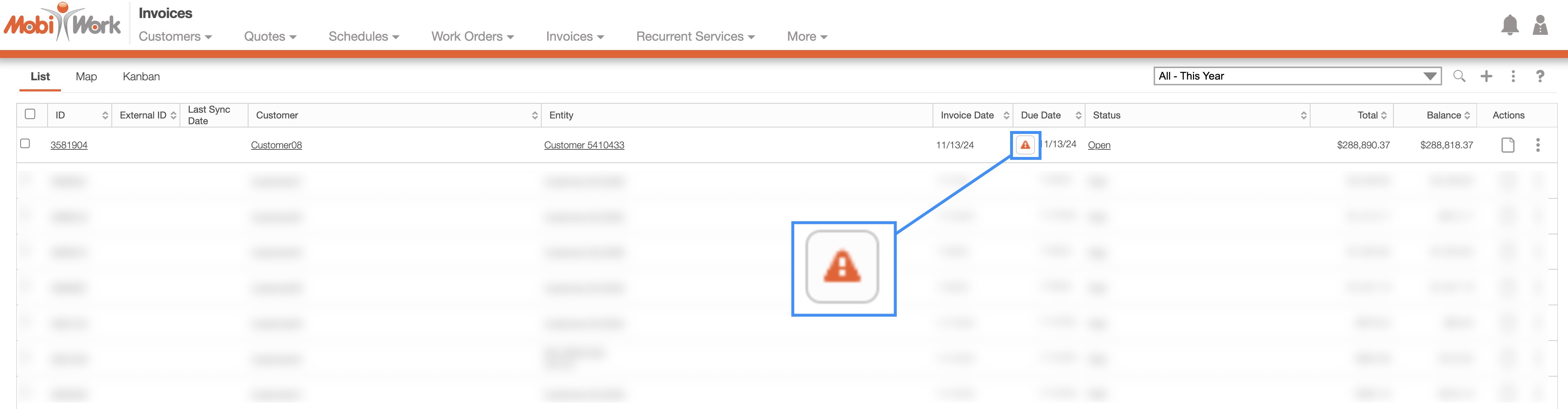 The Caution Sign icon displayed on the Invoices "List" tab indicates overdue invoices with unpaid balances (this includes partially paid payments). This icon appears for any invoice with a remaining balance greater than $0.00:
