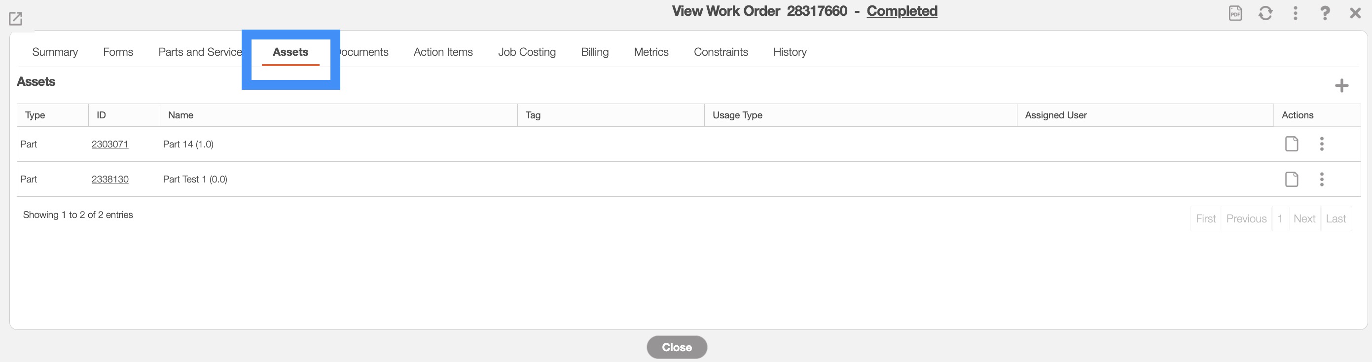 You will be able to locate the assigned parts turned assets in the "Assets" tab of the work order: