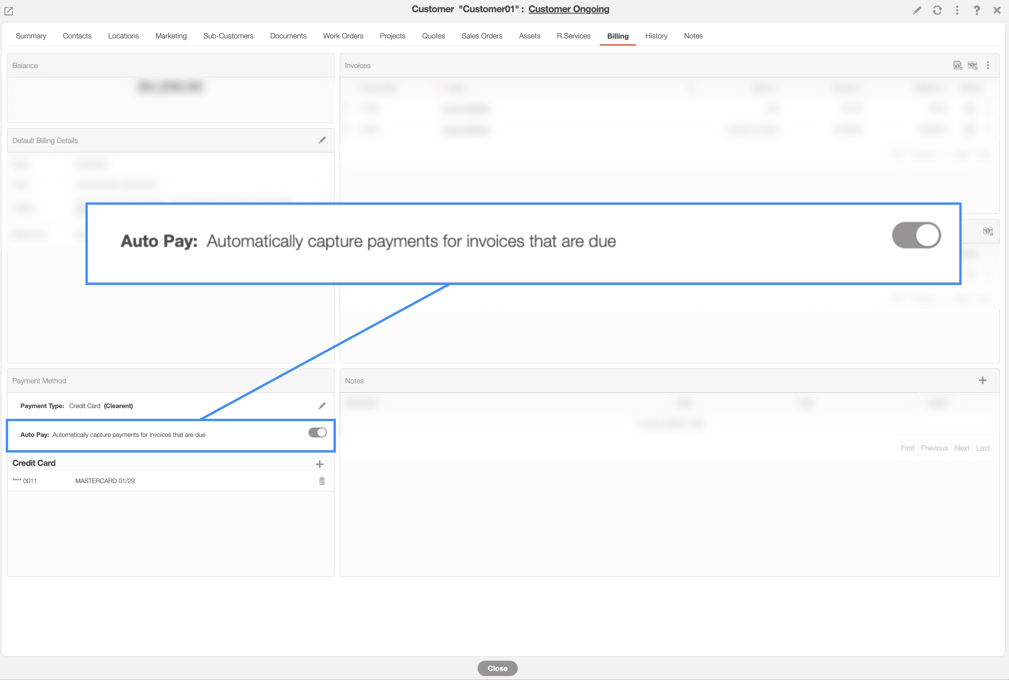 Note: If you need to prevent auto pay for a specific invoice, toggle off the Auto Pay button in the customer profile before the invoice due date; otherwise, the payment will be processed automatically.