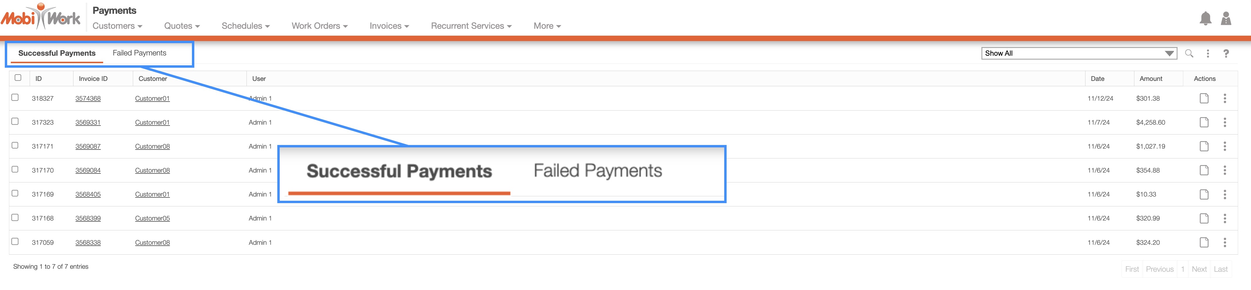 You will be able to see if your payment was successful from the Payments feature page. For more information on how to access this page, please see the Payments List page. All the successful payments will be listed on the "Successful Payments" tab and all the failed payments can be located on the "Failed Payments" tab:
