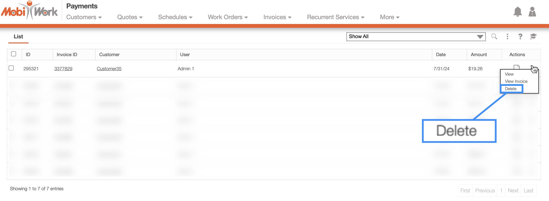 To delete a prepayment from MobiWork, first access the Payment List page. For more information on how to access this page, please see the Payment List page.