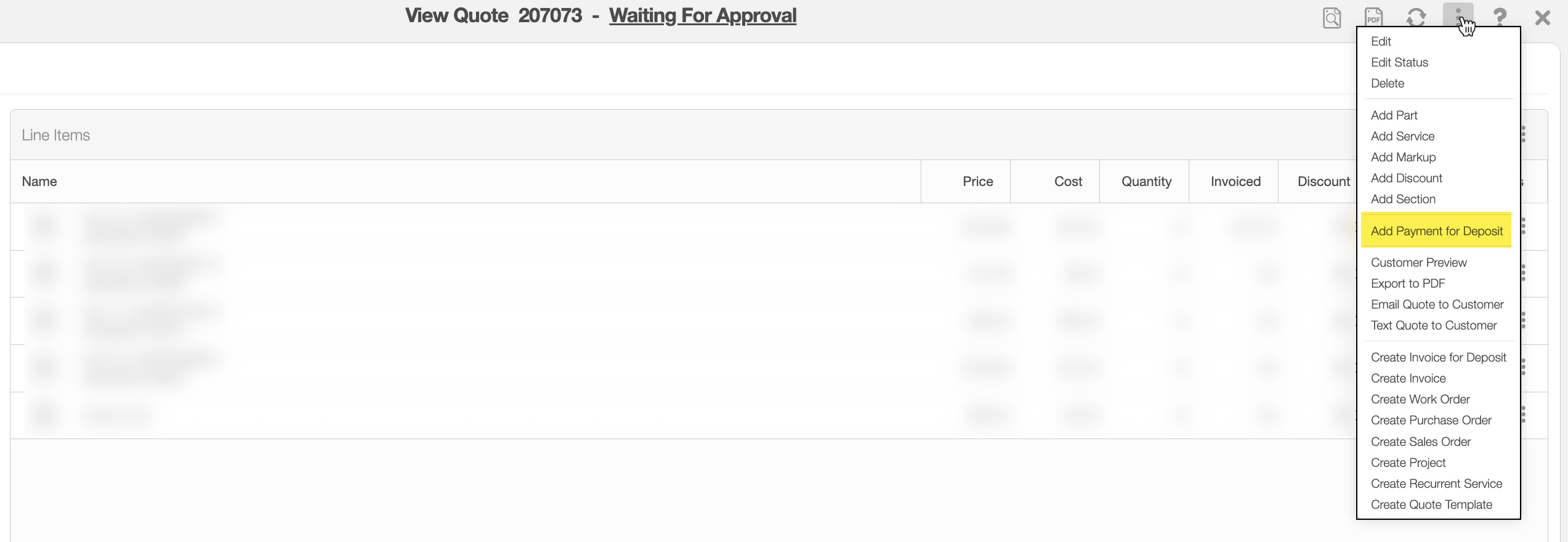 From the More Actions drop-down menu in the View Quote pop-up window, select "Add Payment for Deposit" option: