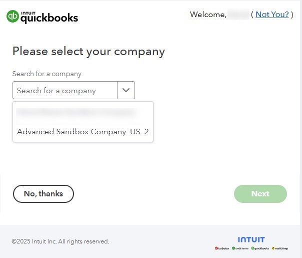On this page, if you have more than one company associated with your QuickBooks Online account, you can select the relevant company: