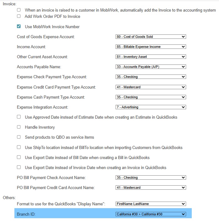 After authorizing your QuickBooks Online accounts to MobiWork, you can associate it with the corresponding branch in your MobiWork connector settings page: