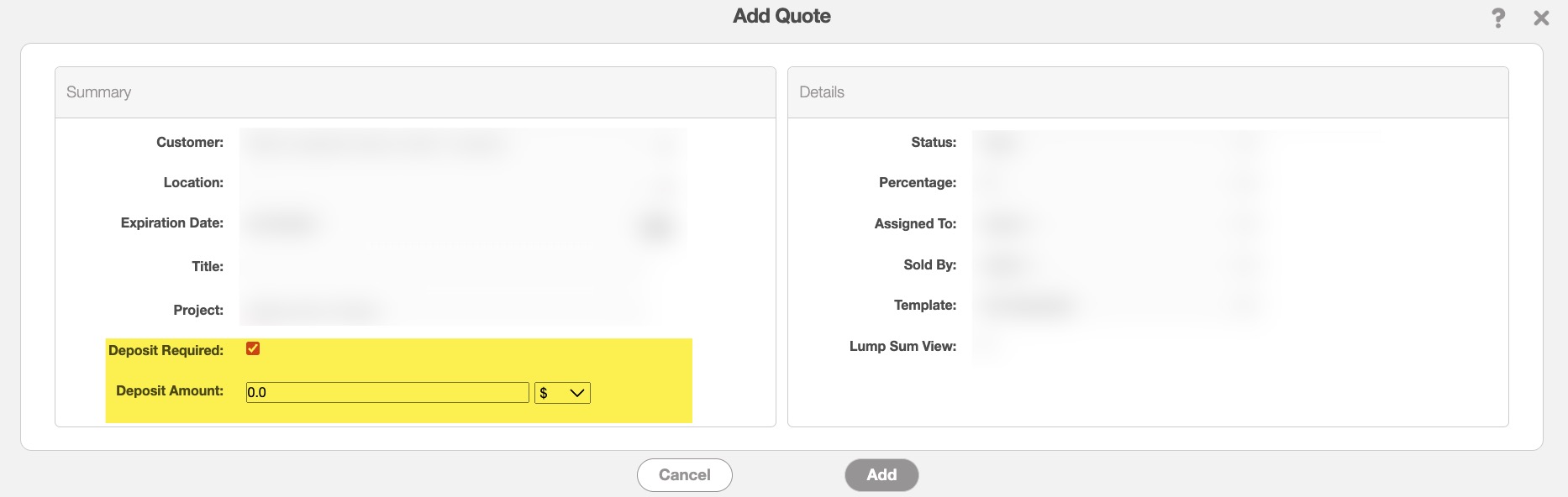 While creating the quote in MobiWork, ensure you check the "Deposit Required" box in the Add Quote pop-up window: