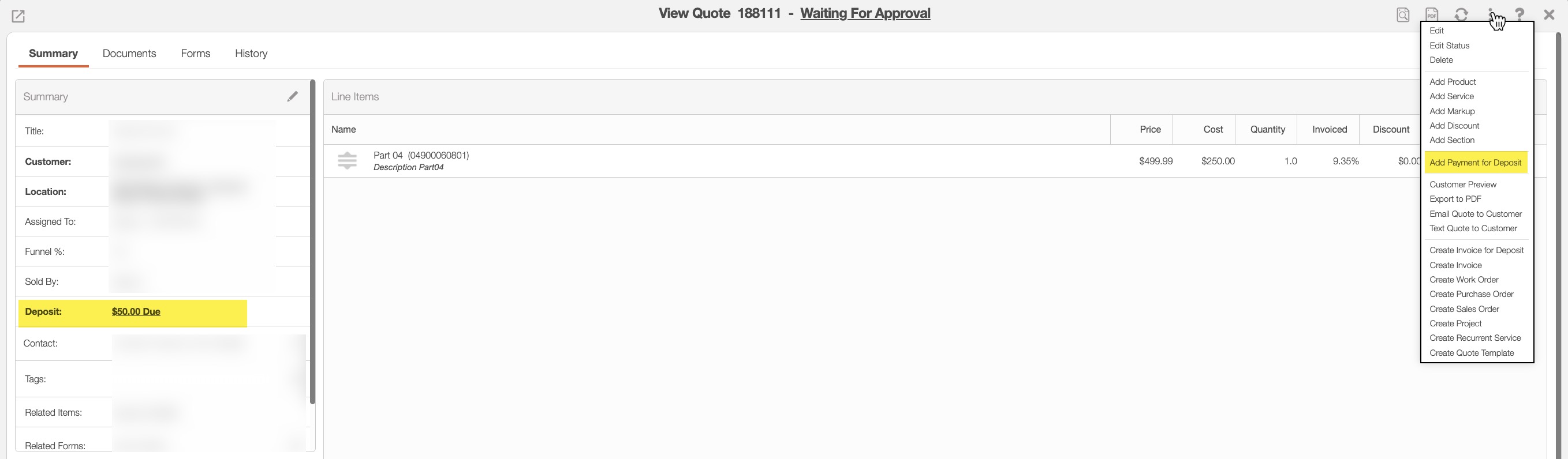 From the More Actions drop-down menu in the View Quote pop-up window, select "Add Payment for Deposit" option: