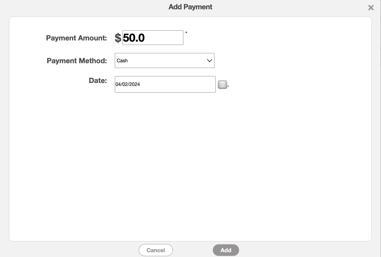 Choose the preferred payment method and click Add to finalize the deposit payment, thus generating a partial invoice for the deposit amount.