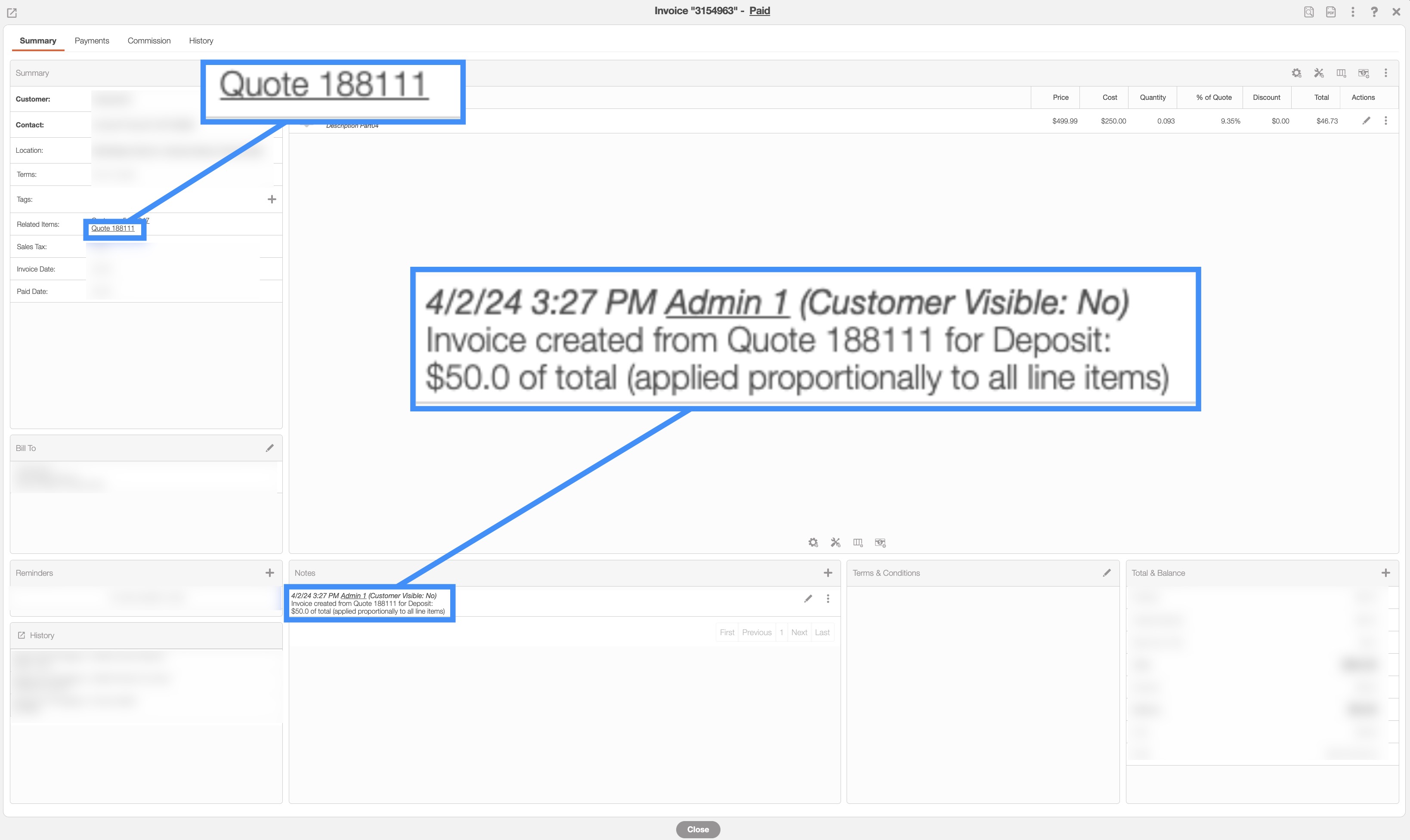 Note: If you create an invoice from the original quote using the "Create Invoice" option, you can view the remaining balance in the View Invoice pop-up window: