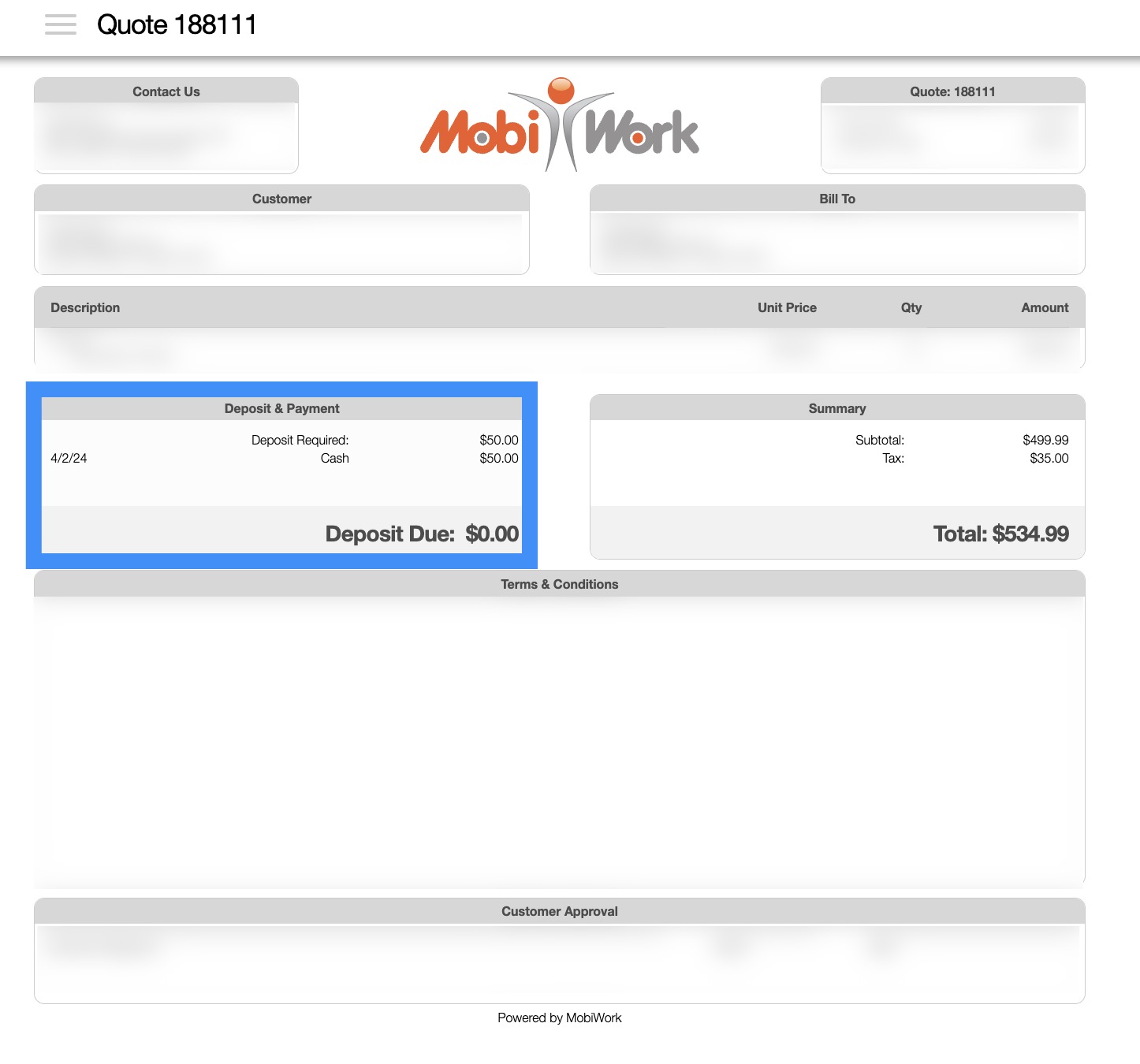 The following steps will highlight how to create a quote deposit in MobiWork.